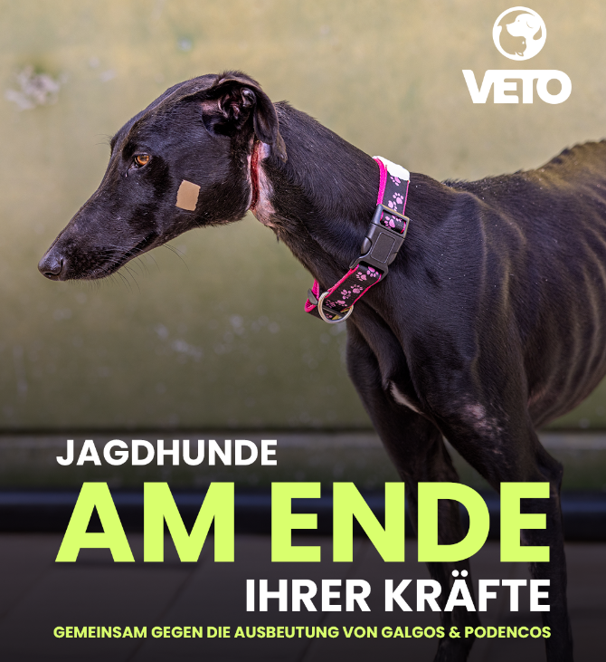 Jedes Jahr endet die Jagdsaison in Spanien für zehntausende Hunde mit Hunger, schweren Verletzungen oder dem Tod. Galgos, Podencos und andere Jagdhunderassen werden für die Jagd missbraucht und aussortiert, sobald sie nicht mehr 'funktionieren'. Um auf dieses systematische Leid aufmerksam zu machen und konkrete Hilfe zu leisten, beteiligt sich ASPA friends e.V. an der VETO-Kampagne 'Die stillen Opfer der Jagd'.
