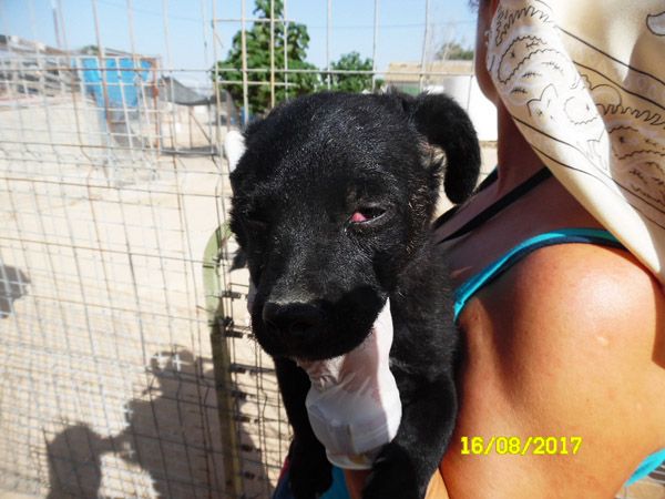 Welpe Chiki wurde vor ein paar Tagen im Tierheim aufgenommen und muss am Auge operiert werden. Der gerade mal 12 cm große und zwei Monate alte kleine Mann wurde von zwei jungen Männern alleine in den Feldern gefunden. Wie Herzlos muss man sein, so ein kleines Wesen in der unerträglichen Hitze Spaniens von momentan über 40 Grad sich selbst zu überlassen.
