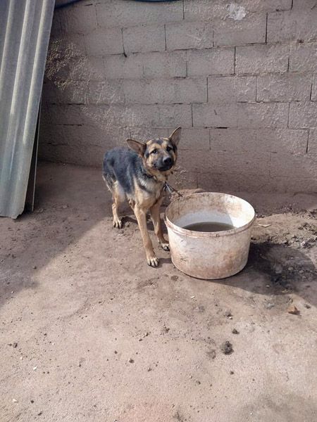Vor ein paar Tagen erhielt das Team vom Verein 'Huellas de Vida' in Villarrobledo, die freiwilligen Perrera-Helfer, eine Nachricht von einem Herren, dass zwei Hunde in sein Grundstück eingebrochen sind und das er sie nicht behalten könnte. Das Team fuhr direkt dorthin, um die Hunde abzuholen und zu ihrer traurigen Überraschung fanden sie dort zwei Hunde vor, die an einer NUR 1 METER langen Kette angebunden waren, ohne Schatten, mit einem Eimer grünem Wasser und ohne Essen!!! Und das in der Sommerhitze Zentralspaniens...