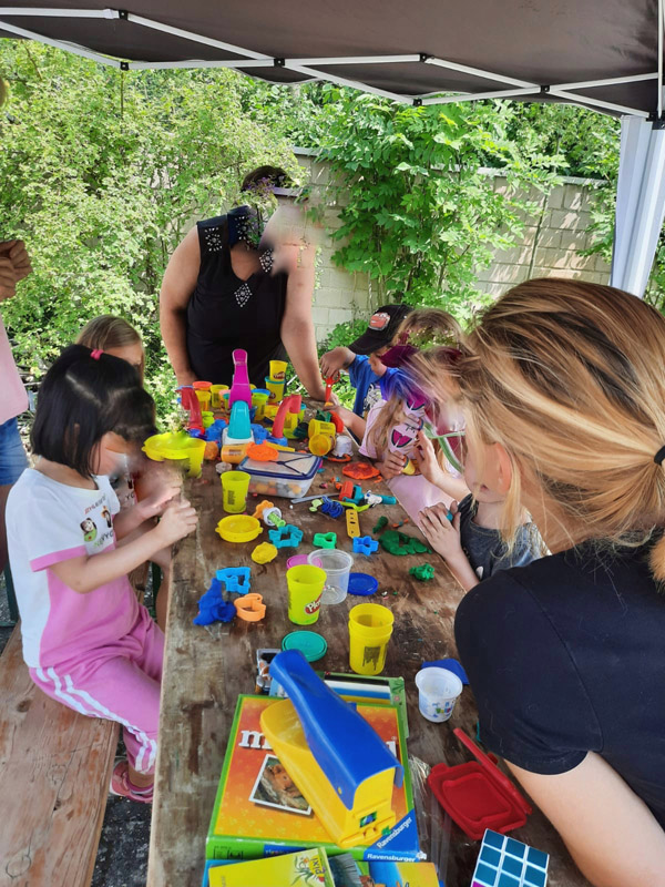 Für die Kinder wurde ein kleiner Outdoorkindergarten zusammengestellt. Tolle Spielsachen waren unter den Spenden, sodass die Kinder ein bisschen abgelenkt werden konnten und auch ein kleiner Ersatz für ein verlorenes geliebtes Spielzeug gefunden werden konnte. Die Kinder wurden von den örtlichen Betreuer und unserer Julie beaufsichtigt. Traurige und etwas ratlose Gesichtchen schauen einen an, manche Kinder möchten kaum sprechen, ziehen sich zurück - sie alle brauchen viel Hilfe, Zuwendung und Betreuung.