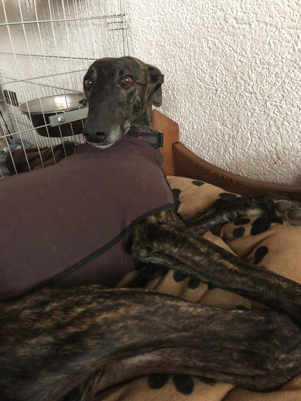 Galgo Amigo ist ja gut in Deutschland angekommen und wird nun liebevoll in seiner Pflegefamilie versorgt. Die Wunden heilen sehr langsam und es ist täglich ein aufwendiger Verbandswechsel nötig, aber Amigo ist ein sehr braver Patient. Allerdings muss auch noch seine Seele heilen, denn er ist noch sehr ängstlich und verschlossen. Am liebsten macht er sich in einem Katzenkörbchen winzig klein oder noch besser unsichtbar. Mit einem gemütlich großen Hundekorb, kann man ihm überhaupt keine Freude machen. So bekommt er nun sein Eckchen nach Wunsch drapiert- gut Ding darf Weile haben… Unser Amigo würde sich über einen Paten sehr freuen, denn seine Genesung wird noch eine Weile dauern.