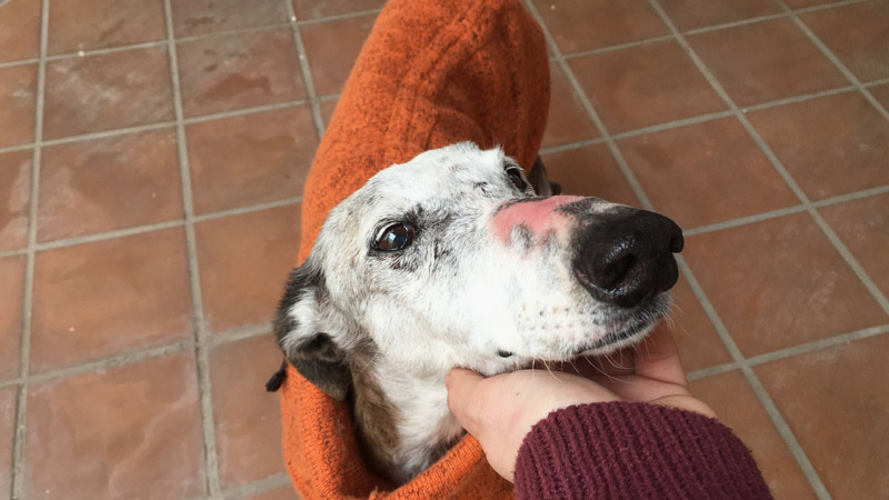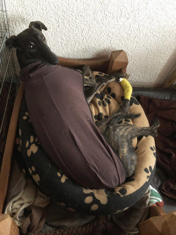 Und Galga Carla, unser Ömchen durfte endlich als Pflegehund zu unserer Alba ziehen. Die Haut wird kontinuierlich besser und von Seiten ihrer Herzerkrankung ist sie gut eingestellt.