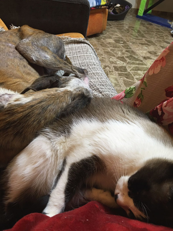 Und wie man sieht, lebt auch diese jagderfahrene Galga in trauter Eintracht mit der Katze von Alba. Wir hoffen, dass Carla im März die Reise in ihr endgültiges Zuhause antreten kann.