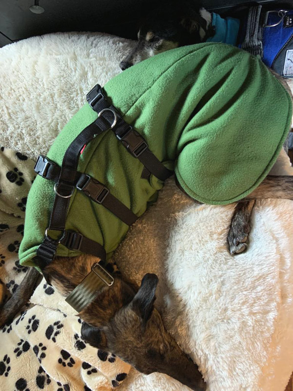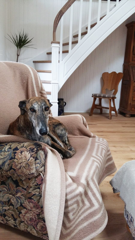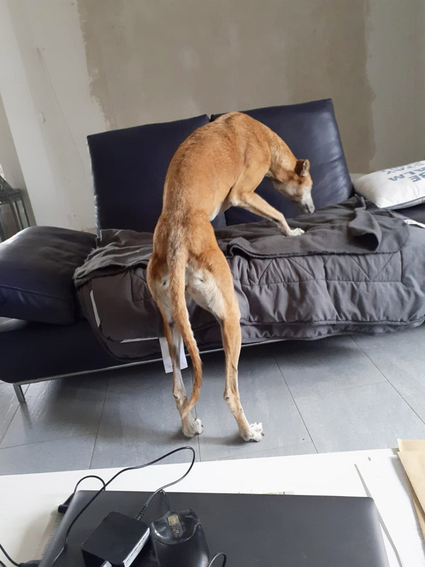Feliz hat ihrem Herrchen klar gemacht, dass sie sein Stammplätzchen als gute Wahl betrachtet (Danke liebe Pepi, dass Du Feliz ihren Namen zum Gedenken an meine verstorbene Galga Feliz gegeben hast, das hat mich sehr berührt und der Name hat ihr doch tatsächlich Glück gebracht).