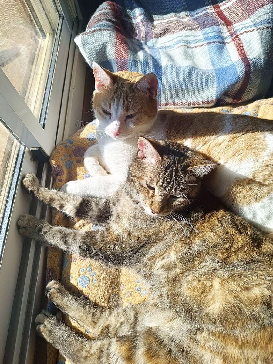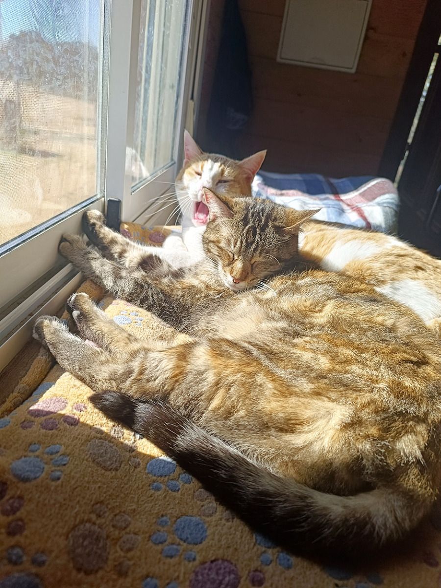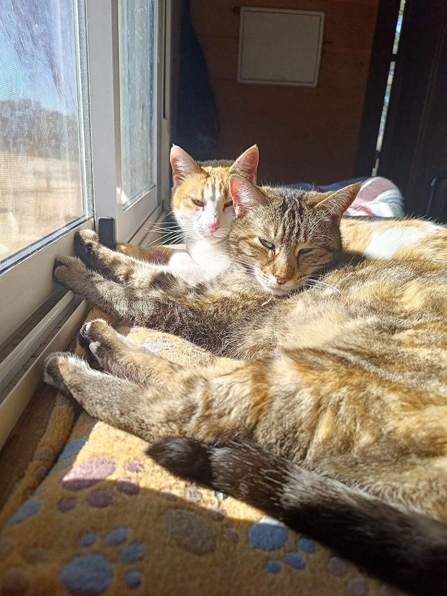 Mia (getigert) und Dulce (weiss-rot) wurden als Katzenwelpen zusammen mit 3 weiteren Geschwistern in einem Karton im Frühling 2018 aufgefunden. Das Albergue Team kümmert sich immer wieder um Fundkatzen, päpelt diese auf, versorgt sie und versucht ein Zuhause für sie zu finden. Mia und Dulce hatten leider kein Glück und da die beiden sich so wohlfühlen im schönen neuen Haus der neuen Albergue 'la Esperanza', durften sie einfach bleiben. Sie haben auch einen wichtigen Job, den beide ganz toll erledigen. Sie machen die Katzentests mit den Albergue-Hunden und besonders Dulce hat bei den Hunden einen siebten Sinn. Die beiden führen ein schönes Leben und werden immer ganz viel geknuddelt vom Team. Wir suchen für Mia und Dulce Paten, die sie etwas bei den Futter- und Tierarztkosten unterstützen möchten. Auch über ein Patenpaket mit Leckereien würden die beiden Damen sich sicher sehr freuen.
