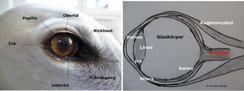 Im wesentlichen ähnelt der anatomische Aufbau des Hundeauges dem des Menschen. Eine Besonderheit ist das dritte Lid, die Nickhaut beim Hund. Auf der Netzhaut liegen die Photorezeptoren, die Stäbchen für das Hell-Dunkel-Sehen und die Zäpfchen für die Farberkennung und die Bildschärfe. Im Vergleich zum Menschen (er hat 3 Zäpfchentypen) hat der Hund nur 2 unterschiedliche Zäpfchentypen. Hunde erkennen